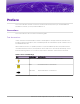 Text Conventions Preface Table 1: Notes and warnings (continued) Icon Notice type Alerts you to... Caution Risk of personal injury, system damage, or loss of data. Warning Risk of severe personal injury. Table 2: Text Convention Description screen displays This typeface indicates command syntax, or represents information as it appears on the screen. The words enter and type When you see the word enter in this guide, you must type something, and then press the Return or Enter key.