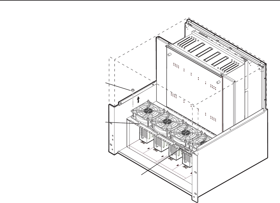8. Lift the two fans off of the fan assembly door retaining posts.
