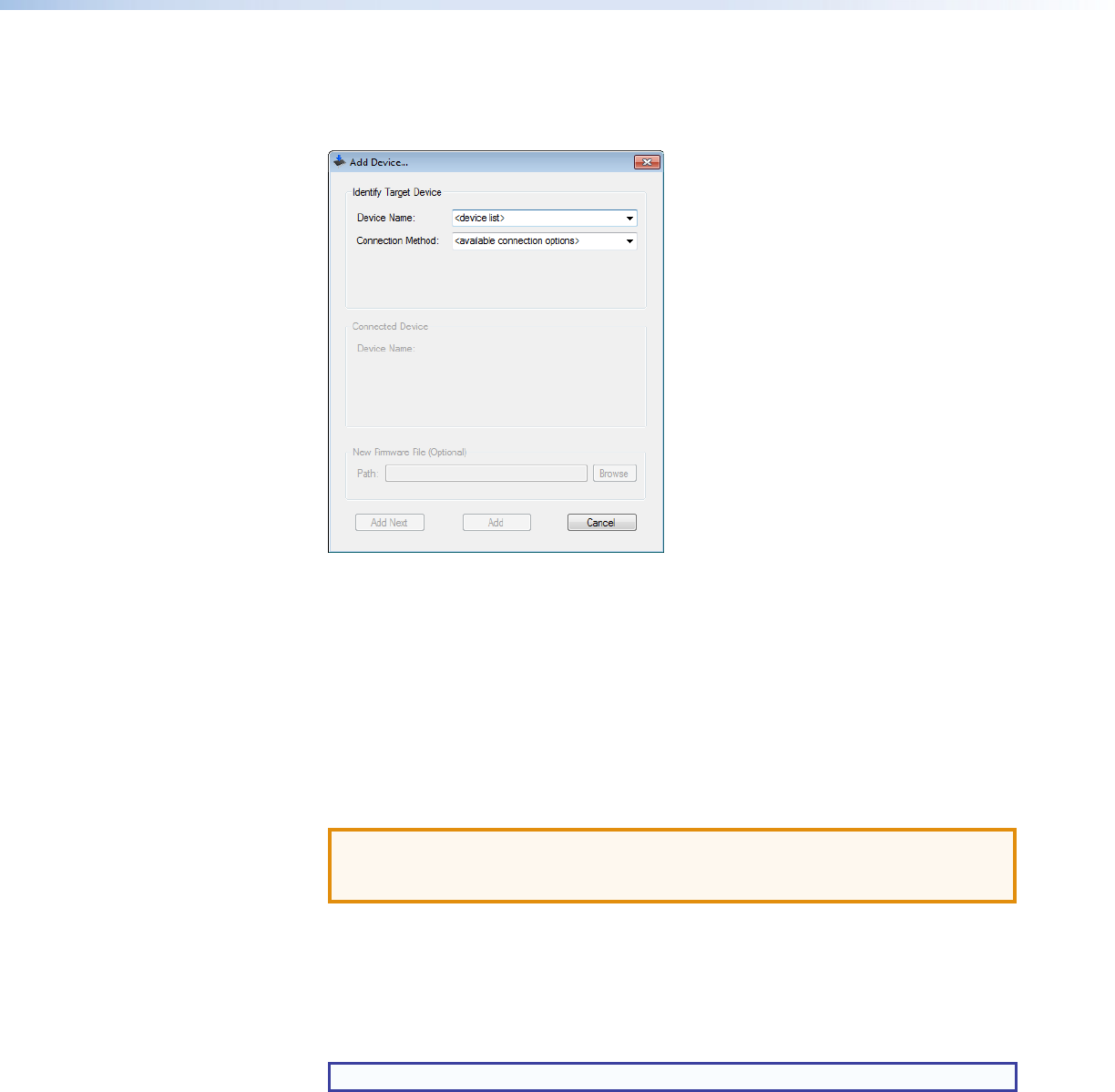 8. Click Add. The Add Device... window closes and the device and firmware are listed in
