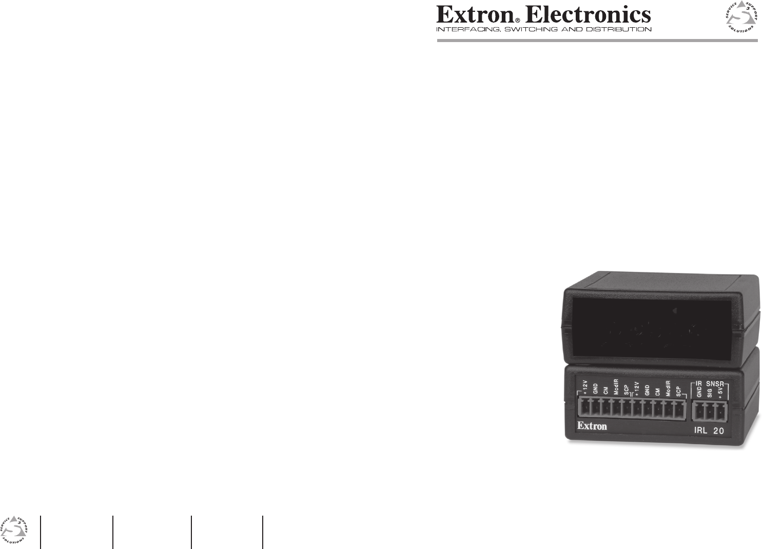User’s Manual IRL 20 IR Repeater www.extron.com Extron Electronics, USA Extron Electronics, Europe Extron Electronics, Asia Extron Electronics, Japan 1230 South Lewis Street Anaheim, CA 92805 USA 714.491.1500 Fax 714.491.1517 Beeldschermweg 6C 3821 AH Amersfoort The Netherlands +31.33.453.4040 Fax +31.33.453.4050 135 Joo Seng Road, #04-01 PM Industrial Building Singapore 368363 +65.6383.4400 Fax +65.6383.4664 Kyodo Building 16 Ichibancho Chiyoda-ku, Tokyo 102-0082 Japan +81.3.3511.7655 Fax +81.3.