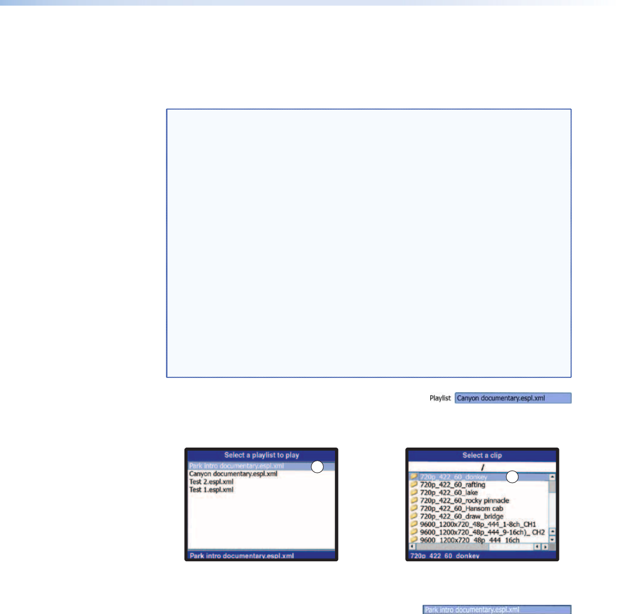 2. Press the Enter button. The Select a playlist screen (a list of playlist les) or Select a clip