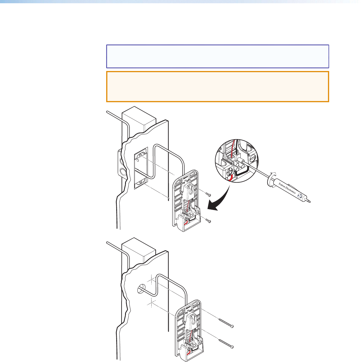 2. Attach the mounting plate to the wall, using two mounting screws (see the illustrations