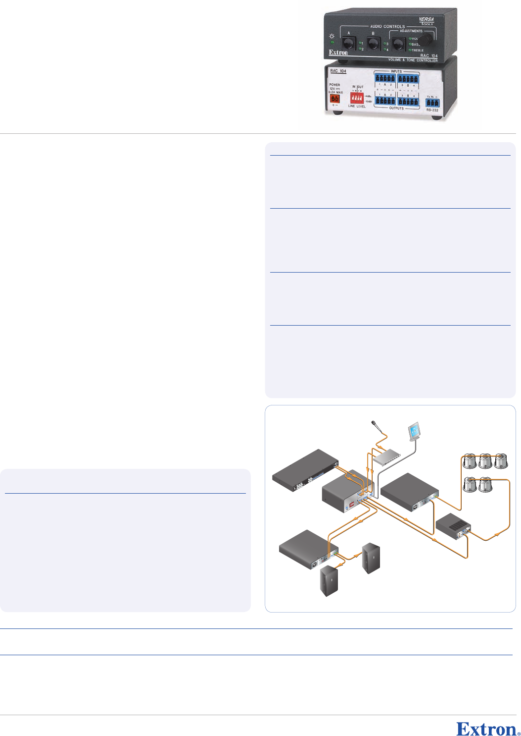 • Volume and tone control via front panel or RS-232