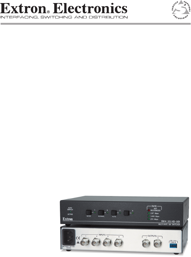 Introduction About this Manual The Extron SW4 3G HD-SDI switcher is a four-input, two parallel output, multi-rate switcher. It allows up to four SDI or HD-SDI video input sources to be switched to two identical outputs on female BNC connectors. The SW4 HD-SDI supports multiple SDI rates, including 270 Mbits per second, 1.485 Gbps, and 2.97 Gbps. The switcher can be controlled via the front panel buttons, or via RS-232 communication, using Extron’s Simple Instruction Set (SIS™).