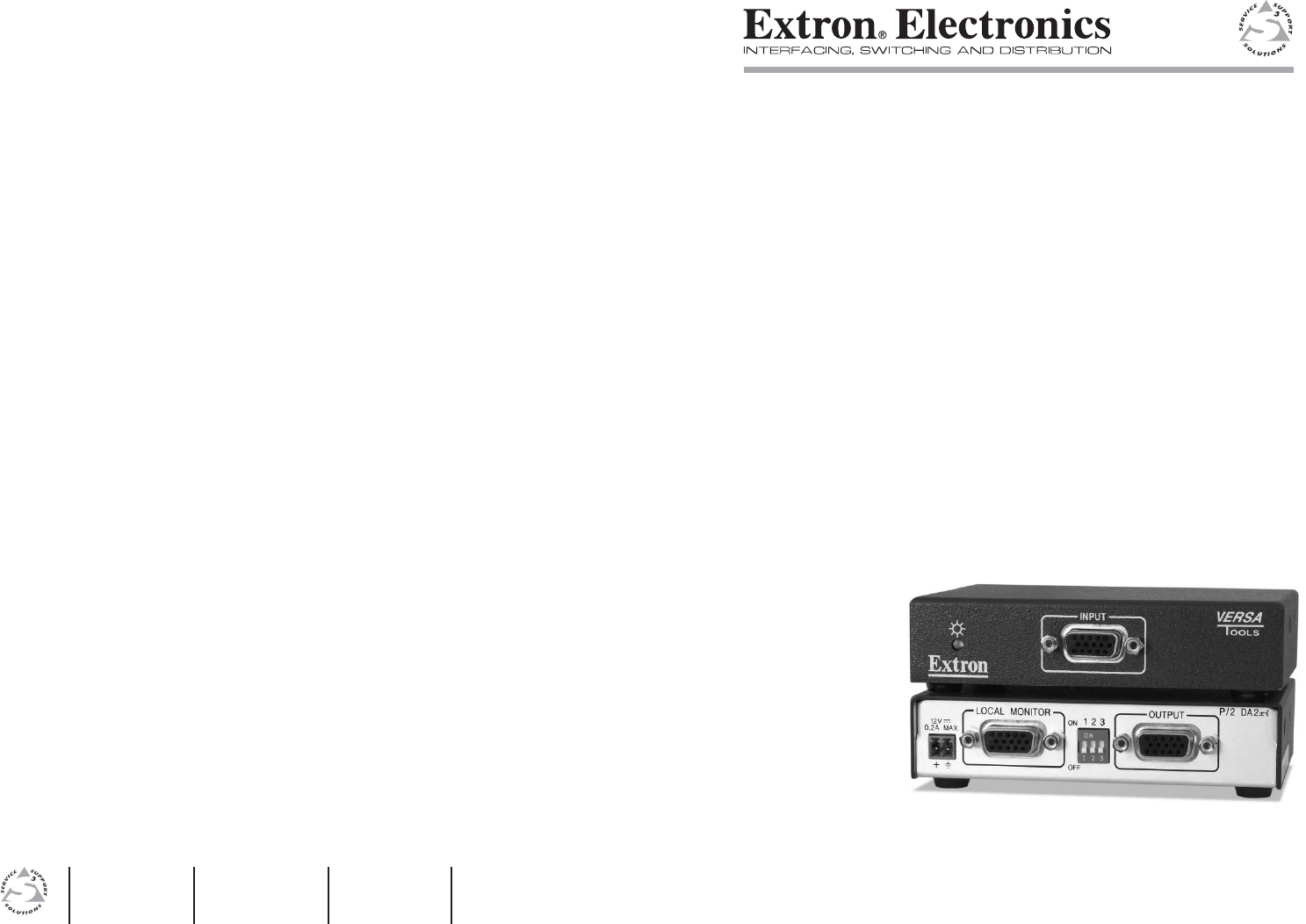 Description The P/2 DA2xi is a high performance one input, two output distribution amplifier that accepts video input from a VGAQXGA compatible PC and distributes that signal to separately buffered outputs. The output can be extended with Extron MHR cables up to 250' in length (XGA resolution signal). The P/2 DA2xi routes all video ID bits to its local monitor output to allow for automatic resolution selection by DDC1 and DDC2 (plug and play cards and projector).