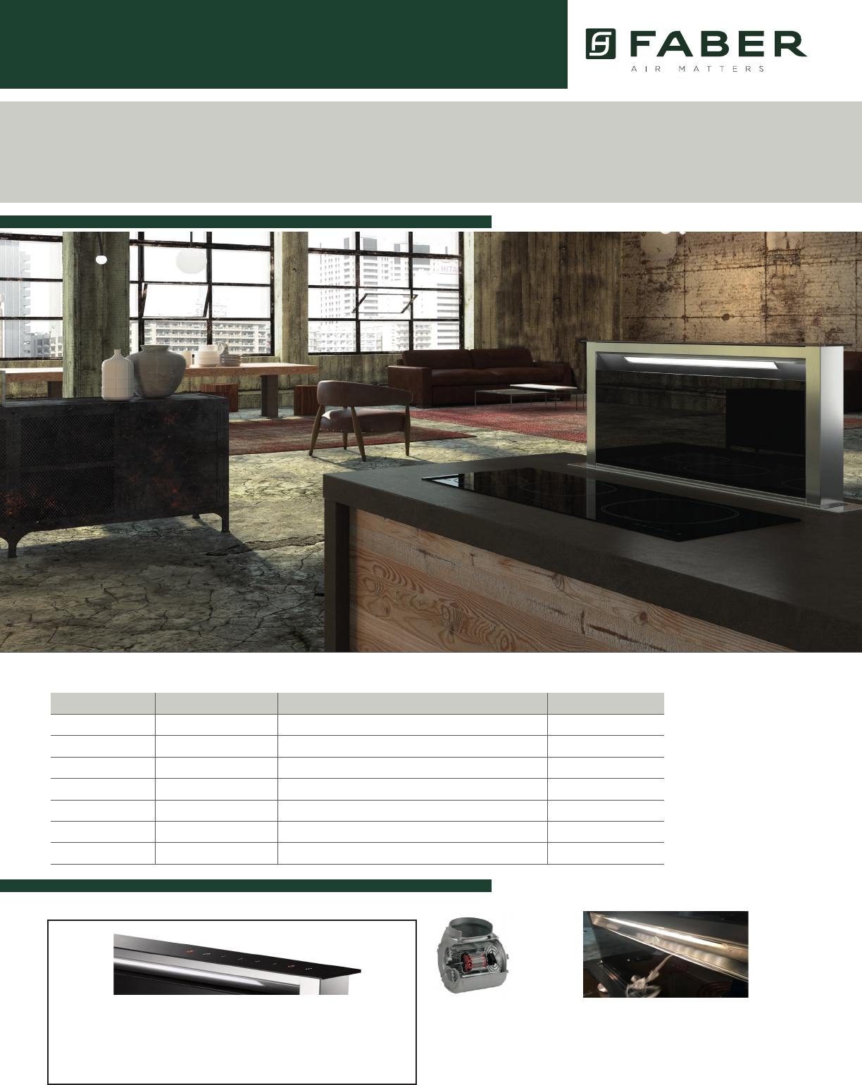 15" TALL RISING DOWN DRAFT WITH GLASS AND LED LIGHTING. THE SCIROCCO LUX GLASS DOWN DRAFT IS PERFECT FOR