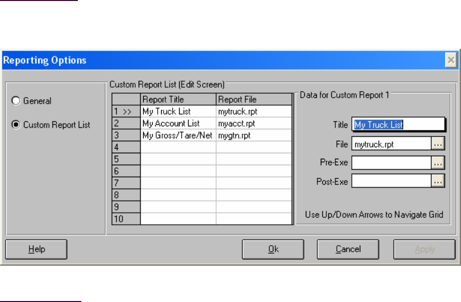 This list contains your custom reports. The active custom report is designated by a >>. You can