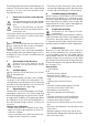 – hanno valore di confronto tra le macchine, – permettono una valutazione provvisoria del carico di rumore e di vibrazioni durante l’uso, – rappresentano l’attrezzo elettrico nelle sue applicazioni principali. Valori maggiori sono plausibili con altre applicazioni, con altri utensili e in caso di scarsa manutenzione. Osservare i tempi di pausa e di funzionamento a vuoto della macchina! Il turbofiltro deve essere sostituito quando è così pieno di polvere da causare la diminuzione della potenza aspirante.