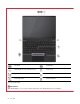 Related topics • “Log in with your face ID” on page 19 • “Detect your presence (for selected models)” on page 20 • “Use the touch screen” on page 12 • “Use the TrackPoint pointing device” on page 10 • “Log in with your fingerprint (for selected models)” on page 19 Side view Audio connector Power connector Thunderbolt™ 4 connector (USB-C) Power button Related topics • “Charge the computer” on page 17 • “USB specifications” on page 5 Chapter 1.