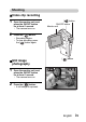SHOOT, PLAY BACK AND SAVE Playback kVideo clip playback 1 Press the REC/PLAY button. h The display switches to the Playback Screen. h Toggle the SET button to the left or right to display the video clip you wish to play back. h Video clips are indicated by a video clip pattern along the top and bottom of the screen. 2 REC/PLAY button SET button Press the SET button. h Playback of the selected video clip begins. kStill image playback 1 Press the REC/PLAY button.
