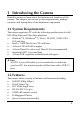 camera. This chapter also covers system requirements, package