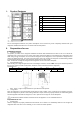 I. Product Features No Description 1 Temperature control knob 2 Glass shelves 3 Freezer drawer 4 Adjustable Feet 5 Little Bottle racks 6 Bottle rack Due to technological innovations, the product descriptions in this manual may not be completely consistent with your refrigerator. Detailed information is in accordance with the final product. II. Preparations for use Installation location: 1.