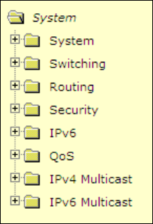 The 8 menu options available are: System, Switching, Routing, Security, IPv6, QOS, IPv4 Multicast and