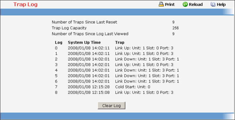 This screen lists the entries in the trap log. The information can be retrieved as a file by using System