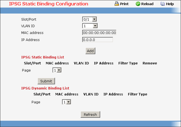 • Page - Lists the Number of Pages the IPSG static binding entries occupied. Select the Page