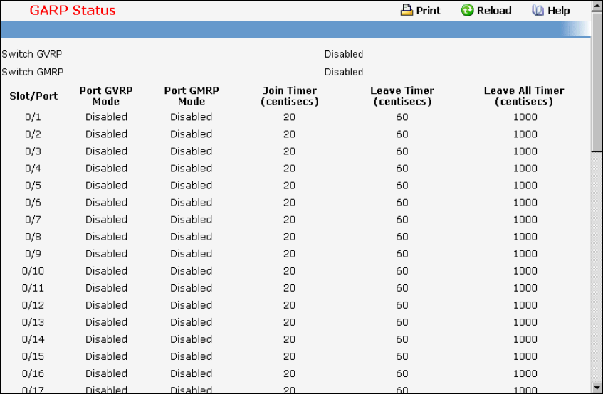 This screen shows the GARP Status for the switch and for the individual ports. Note that the timers are