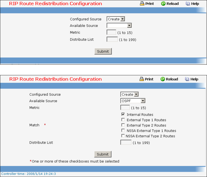 This screen can be used to configure the RIP Route Redistribution parameters. The allowable values for