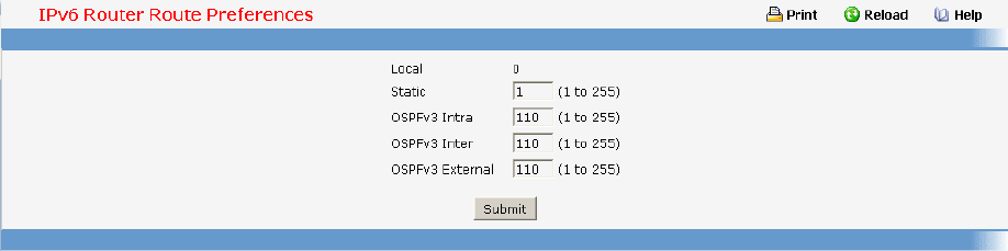OSPFv3 Intra - The OSPFv3 intra route preference value in the router. The default value is 110. The