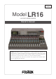 8588103000 (479095) Model LR16 LIVE RECORDING MIXER Ownerʼs manual : The LR16 will be upgraded to a new version for feature en- hancement or improvement. Check the information about the latest software version from the Fostex website (http://www.fostexinternational.com/), Fostex service station or your local Fostex dealer. You can upgrade the software yourself. See page 80 for details about how to upgrade the software.
