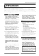 Model LR16 [Introduction/Overview] • You can format the internal hard disk drive via the MENU mode. For details, see “Formatting the internal hard disk drive” on page 78. About CAT-5 cable • Use only a CAT-5 STP cable for connection between the main unit and the control unit. About version upgrade : Do not connect or disconnect a CAT-5 cable while the LR16 is powered on. When you connect or disconnect a CAT-5 cable, make sure that the LR16 is powered off.