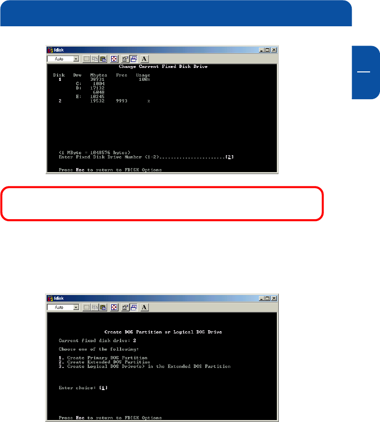 7. Select Option 1 "(Create DOS partition or Logical DOS drive)" by pressing '1'