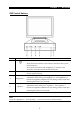 Chapter 1 — Welcome OSD Control Buttons ICON 1 2 Power LED 3 Brightness + 4 Brightness – 5 Speaker + 6 Speaker – FUNCTION Press the Power button to start up the system. Press the Power button for 4 seconds to shut down the system from hardware. Press the Power button and “Brightness +” button for 4-6 seconds to reset the system from the hardware. Red: Standby mode. Green: System start up.