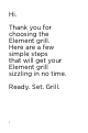 Hi. Thank you for choosing the Element grill. Here are a few simple steps that will get your Element grill sizzling in no time. Ready. Set. Grill.