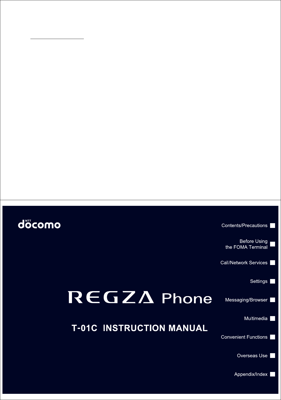 DOCOMO W-CDMA, GSM/GPRS and Wireless LAN System Thank you for purchasing "REGZA Phone T-01C". Make sure thoroughly read this manual and manuals included with optional accessories before and during use of your T-01C to ensure proper operation. If any of the contents in this manual are unclear, please contact "docomo Information Center" on the last page of this manual. The T-01C is your capable partner. Please handle the T-01C with care to ensure a long service life.