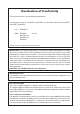 Declaration of Conformity This printer conforms to the following Standards: Low Voltage Directive 73/23/EEC, 93/68/EEC and the EMC Directive 89/336/EEC, 92/31/EEC, 93/68/EEC. LVD : EN60950-1 EMC : EN55022 EN61000-3-2 EN61000-3-3 EN55024 Class A This declaration is applied only for 230V model. IMPORTANT: This equipment generates, uses, and can radiate radio frequency energy and if not installed and used in accordance with the instruction manual, may cause interference to radio communications.