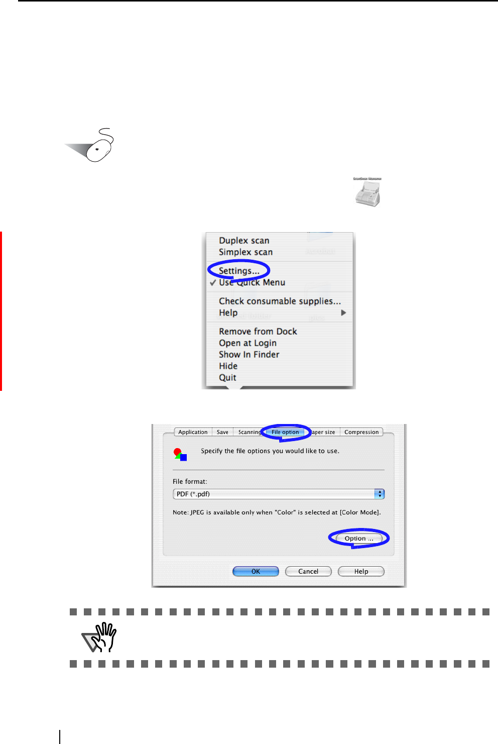 1. Click and hold the mouse button on the ScanSnap icon , and select "Settings"