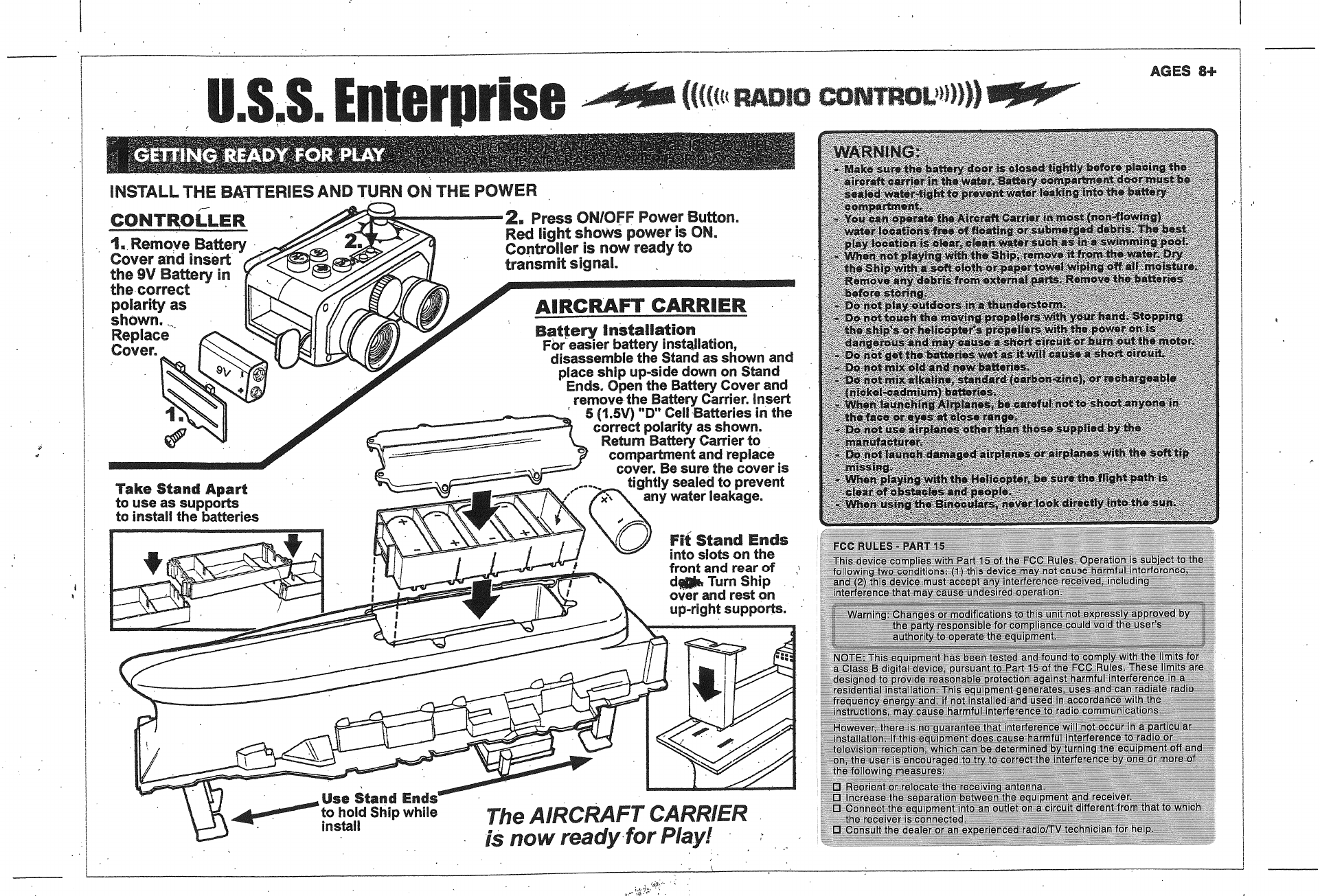 |. 4. Remove Battery Cover and insert the 8V Battery in the correct polarity as shown. Replace Cover. _ Take Stand Apart £0 uss as supports to install the batteries 2. Press ON/OFF Power Button. Red light shows power is ON, Controller is now ready to transmit signal. AIRCRAFT CARRIER Battery Installation For easier battery Installation, disassemble the Stand as shown and place ship up-side down on Stand Ends. Open the Battery Cover and _remove the Battery Carrier. Insert § {1.