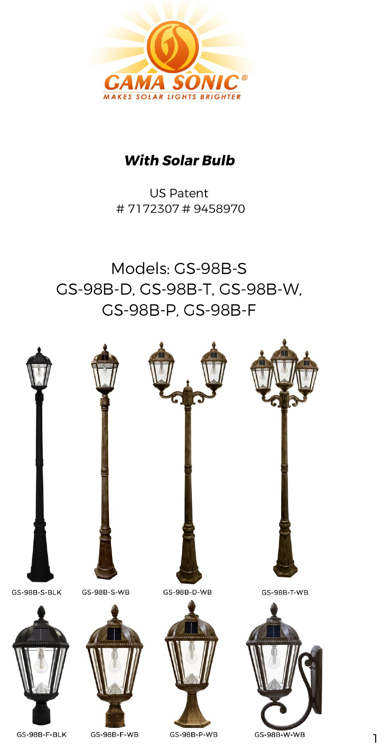 Installation Instructions for model GS-98B-P Installation Instructions for model GS-98B-F Installation Instructions for model GS-98B-W Replacing the Solar LED Bulb Replacing the Batteries