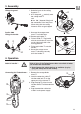 GB 3. Assembly Fitting the guard : 1. Undo the knots in the cutting filaments 1. 2 2. 1 Fit the guard 2 vertically onto the cutting head 3 and 2 turn 180° (bayonet fitting) until the connection clicks into place. When doing this the cutting filaments must not get trapped. ProCut 1000 Fitting the handle : J 4 5 1. Unscrew the orange screw cover 4 anti-clockwise. 2. Remove grip holder 6. 3. Fit the handle 5. The handle with the start button J must be on the right hand side in the working position. 4.