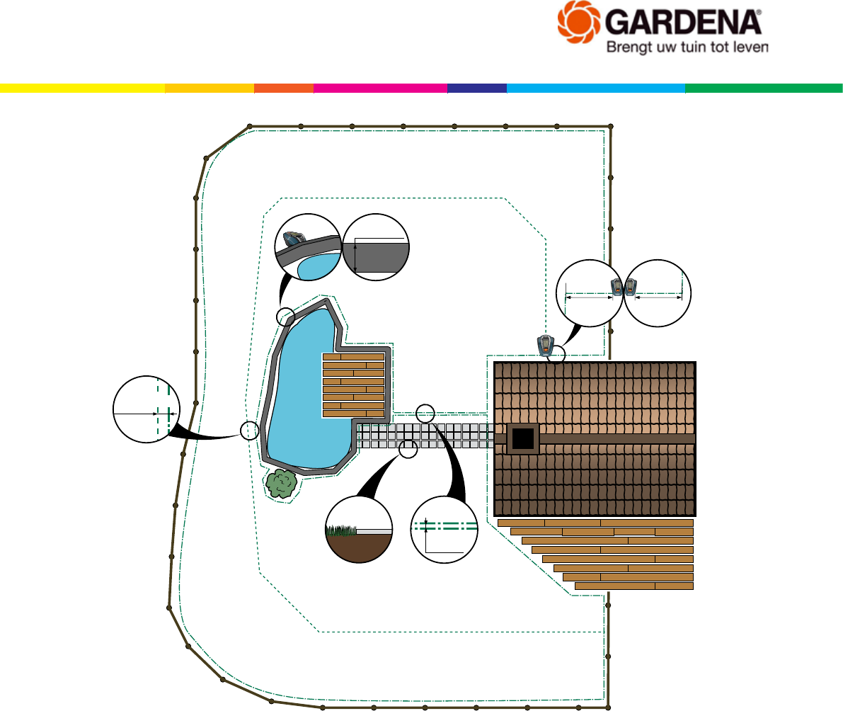 • De begrenzingsdraad moet 30 cm van deze muur of omheining geplaatst worden. Zo zal de robotmaaier niet gekrast