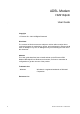 Introduction 1 Introduction Congratulations on becoming the owner of an Ericsson ADSL Modem HM210dp/di. Your LAN (Local Area Network) will now be able to access the Internet using your high-speed ADSL connection. 1.1 About this User Guide This User Guide describes how to install and setup your HM210dp/di in a Windows environment, and how to customize its configuration to get the most out of your new product. The Glossary includes abbreviations and explanations to technical terms used in this guide. 1.