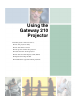 Using the Gateway 210 Projector Read this guide to find out how to: ■ Use the projector safely ■ Use the remote control ■ Set up and connect the projector ■ Start and turn off the projector ■ Use the On-screen display (OSD) menus ■ Replace the lamp module ■ Troubleshoot typical hardware problems 1