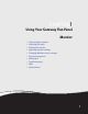 CHAPTER1 Using Your Gateway Flat-Panel Monitor • • • • • • • • • • Connecting the monitor Adjusting the angle Starting the monitor Adjusting monitor settings Changing Windows screen settings Power management Maintenace Troubleshooting FAQs Specifications 1