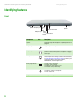 www.gateway.com Identifying features Bottom Docking port Battery Battery lock Battery latch Memory bay System label Hard drive bay Component Icon Description Docking port Connect the optional port replicator to this port. Warning: Power is passed through this port. This docking connection is certified to UL 1950 for use only with port replicators designed for your Gateway notebook. Battery Provides power when the notebook is not plugged into AC power.