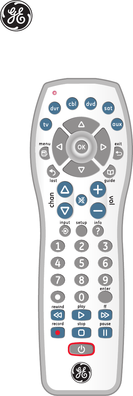 Programación de su Control Remoto Su control remoto universal GE está diseñado para controlar múltiples dispositivos de audio/video como televisores, DVD, videograbadoras digitales, aparatos de satélite, cable y audio con un solo control remoto. Para utilizar este control remoto, tendrá que programarlo para que controle los dispositivos de su elección. Hay dos maneras de programar el control remoto: entrada directa de códigos y búsqueda automática de códigos. Entrada Directa de Códigos (se Recomienda) 1.