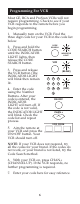 Programming For VCR Most GE, RCA and ProScan VCRs will not require programming. Check to see if your VCR responds to the remote before you begin programming. 1. Manually turn on the VCR. Find the three digit code for your VCR in the code list below. CODE SEARCH 2. Press and hold the CODE SEARCH button until the INDICATOR LIGHT lights, then release the CODE SEARCH button. 3. Press and release the VCR button (The INDICATOR LIGHT will blink then remain lit. 4. Enter the code using the Number Buttons.