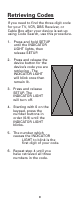 Retrieving Codes If you need to find the three-digit code for your TV, VCR, DBS Receiver, or Cable Box after your device is set-up using Code Search, use this procedure. 1. Press and hold SETUP until the INDICATOR LIGHT lights, then release SETUP. 2. Press and release the device button for the device’s code you are retrieving . The INDICATOR LIGHT will blink once then remain lit. 3. Press and release SETUP. The INDICATOR LIGHT will turn off. 4.