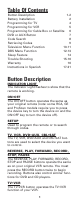Table Of Contents Button Description 1-2 Battery Installation 2 Programming for TV 4 Programming for VCR 5 Programming for Cable Box or Satellite 6 DVD or AUX Button 7 Code Search 8 Retrieving Codes 9 Television Menu Function 10-11 DBS Menu Function 12-13 Sleep Feature 14 Trouble Shooting 15-16 Warranty 16 Instructions in Spanish 17-31 Button Description INDICATOR LIGHT The Indicator Light flashes to show that the remote is working.