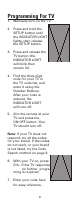 Programming For TV 1. Manually turn on the TV. 2. Press and hold the SETUP button until the INDICATOR LIGHT lights, then release the SETUP button. 3. Press and release the TV button (the INDICATOR LIGHT will blink then remain lit). 4. Find the three digit code for your TV in the TV code list, and enter it using the Number Buttons. After your code is entered, the INDICATOR LIGHT will turn off. 5. Aim the remote at your TV and press the ON•OFF button. Your TV should turn off.