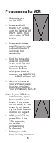 Programming For VCR 1. Manually turn on the VCR. 2. Press and hold the SETUP button until the INDICATOR LIGHT lights, then release the SETUP button. 3. Press and release the VCR button (the INDICATOR LIGHT will blink then remain lit). 4. Find the three digit code for your VCR in the code list and enter it using the Number Buttons. After your code is entered, the INDICATOR LIGHT will turn off. 5. Aim the remote at your VCR and press the ON•OFF button. Your VCR should turn off.
