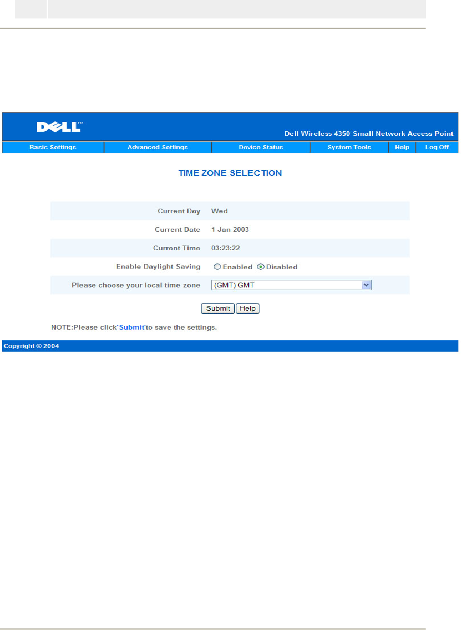 The Time Zone page is used to set the time on the Dell Wireless 4350 Small Business Access