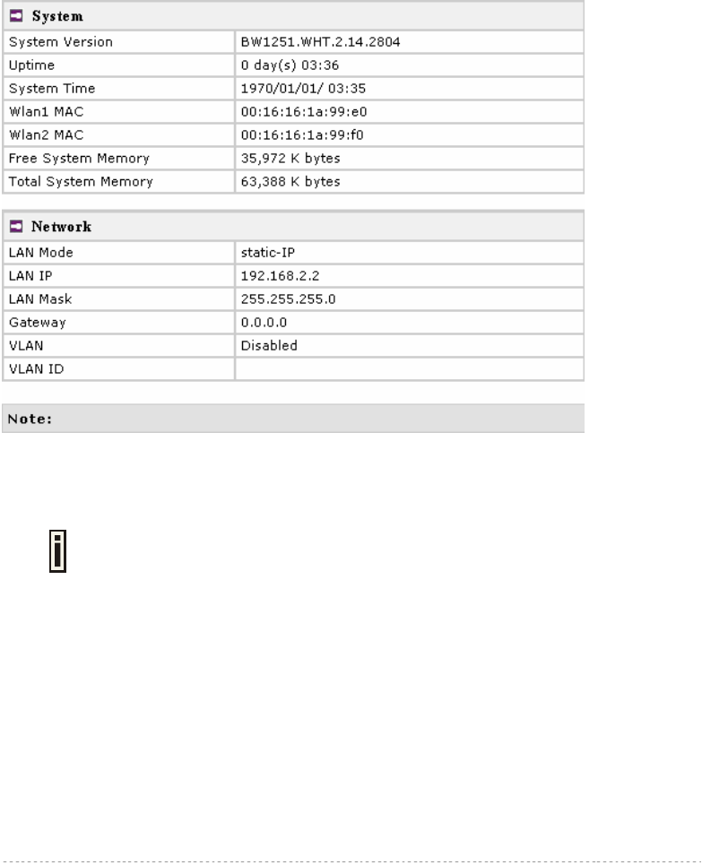 The device status page shows important information of the BW1251, its system status and network