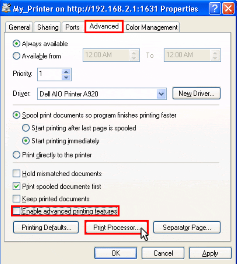 3. Click the Advanced tab, make sure that Enable advanced printing features is