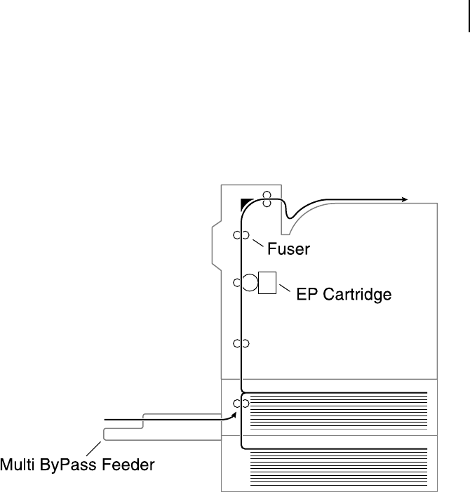 The following illustrations show the paper path through the printer in its standard configuration and also