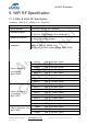 AP6234 Datasheet 5. WiFi RF Specification 5.1 2.4GHz & 5GHz RF Specification Conditions : VBAT=3.6V ; VDDIO=3.3V ; Temp:25°C Feature Description WLAN Standard IEEE 802.11a/b/g/n, WiFi compliant Frequency Range 2.400 GHz ~ 2.4835 GHz (2.4 GHz ISM Band) 5.150 GHz ~ 5.850 GHz (5.0 GHz ISM Band) Number of Channels 2.4GHz:Ch1 ~ Ch11 5.0GHz:Please see the table1 Modulation 802.11a : OFDM /64-QAM,16-QAM, QPSK, BPSK 802.11b : DQPSK, DBPSK, CCK 802.11 g/n : OFDM /64-QAM,16-QAM, QPSK, BPSK 802.