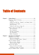 Table of Contents Chapter 1 Getting Started ....................................................................... 1-1 Getting the Tablet PC Running ....................................... 1-2 Unpacking ............................................................... 1-2 Installing the SIM Card (Optional) and Battery Packs..... 1-3 Connecting to AC Power ............................................ 1-5 Using the Tether ......................................................